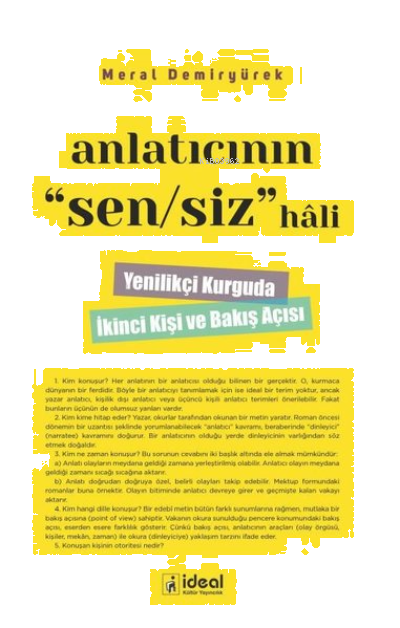 Türk edebiyatında ikinci kişili anlatıcı ve bakış açısıyla yazılmış hikâye ve romanların sayısı, her geçen gün çoğalmasına rağmen konunun teorik yönünü ele alan yayınlar yok denecek kadar azdır.