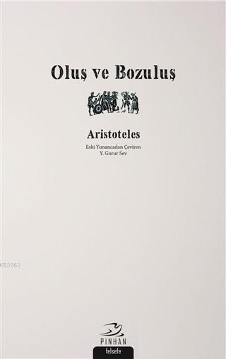 Tanrı, ilk madde, dört öğe (başka bir deyişle "yalın cisimler", yani toprak, su, ateş, hava), oluş, bozuluş, başkalaşma, değişme, büyüme, etki, edilgi, karışım gibi konuları ele alan Oluş ve Bozuluş, Aristoteles'in oldukça kritik bir eseri. Eseri önemli kılan bir diğer unsur da Aristoteles'in belki de en önemli iki metni olan Fizik ve Metafizik'te detaylı çözümlenmemiş konuları açıklığa kavuşturması, bir bakıma bu büyük eserleri anlamanın anahtarı olması. Ayrıca Sokrates-öncesi filozoflardan Demokritos ve Empedokles eleştirileri ve Timaios metni üzerinden Platon'a verilen yanıtlar da eseri cazip kılıyor. Yunanca aslından ilk kez Türkçeye kazandırılan Oluş ve Bozuluş, iki dilli bir baskı, detaylı sözlük ve dizinle sunuluyor.
